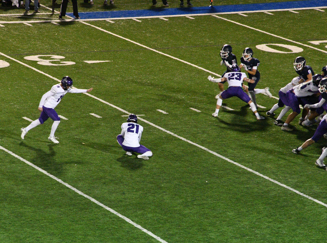 Chaska tied the score at 14-14 with 9:30 left in the fourth quarter with a 7-yard touchdown pass from Matt Welter to Tyler Forrest. St. Thomas bounced back with their own 17-yard run a few minutes after that to regain the lead at 21-14. Chaska followed with a strong offensive effort, finishing off with a Morgen Engeman 2-yard run to bring the score to 21-21 with less than 3:00 to play. Chaska held St. Thomas and moved the ball sufficiently on the following drive to set up for a 42-yard field goal with two seconds remaining. Quinn Meyer, who has had a very successful year kicking extra points and field goals for the Hawks, lined up.