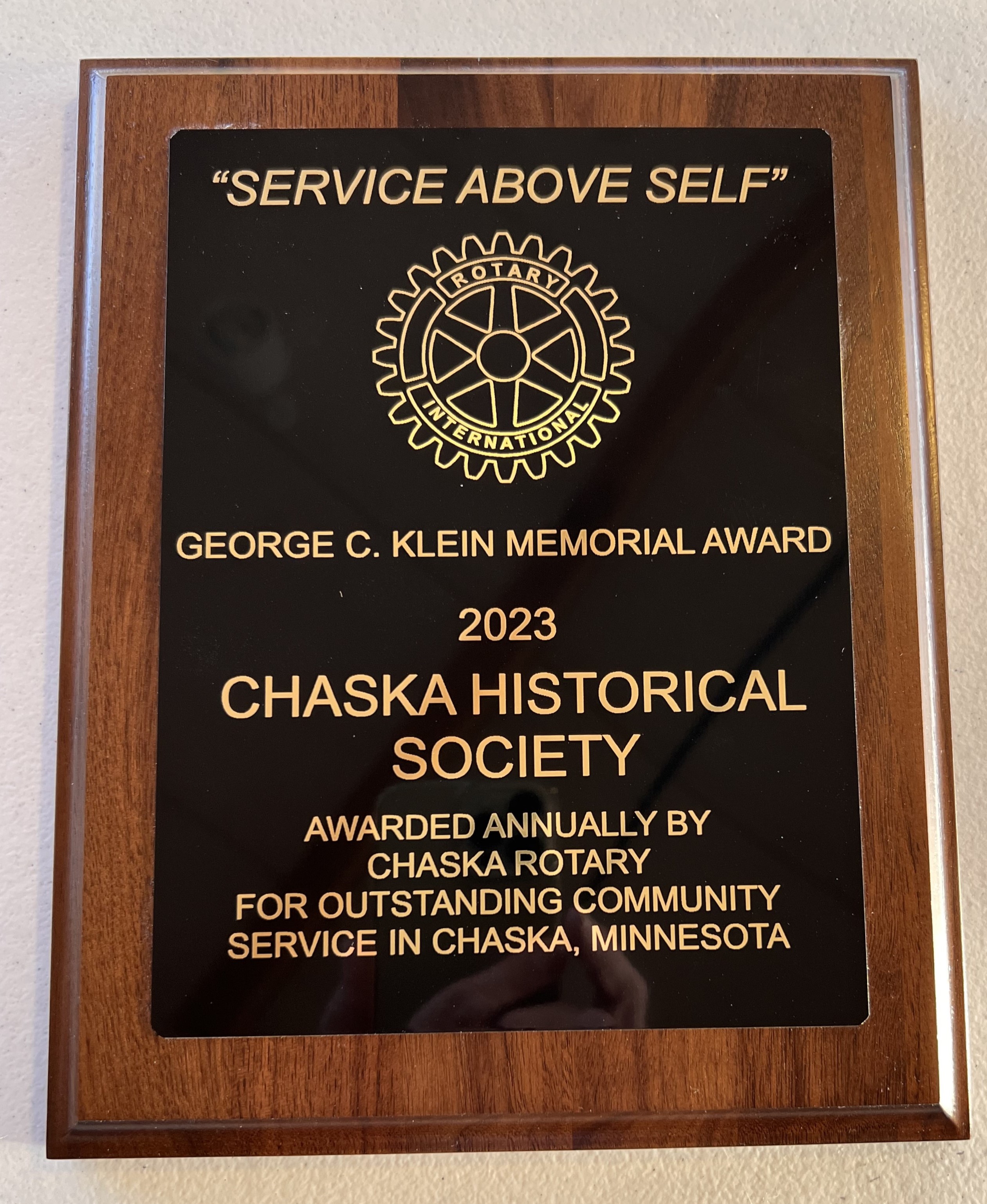 At its weekly meeting on March 13, the Chaska Rotary Club presented its George C. Klein Award for Service Above Self to the Chaska Historical Society.