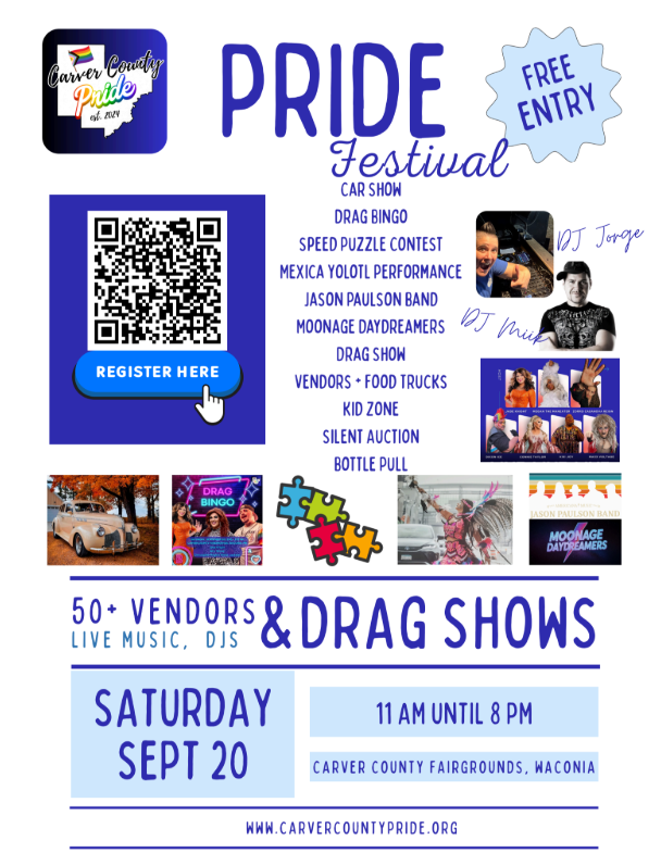 Carver County Pride Festival is a family-friendly celebration! Join us for 60+ vendors, 10+ food trucks, DJs, live bands, drag bingo, drag show, speed puzzle contest, car show, and more!