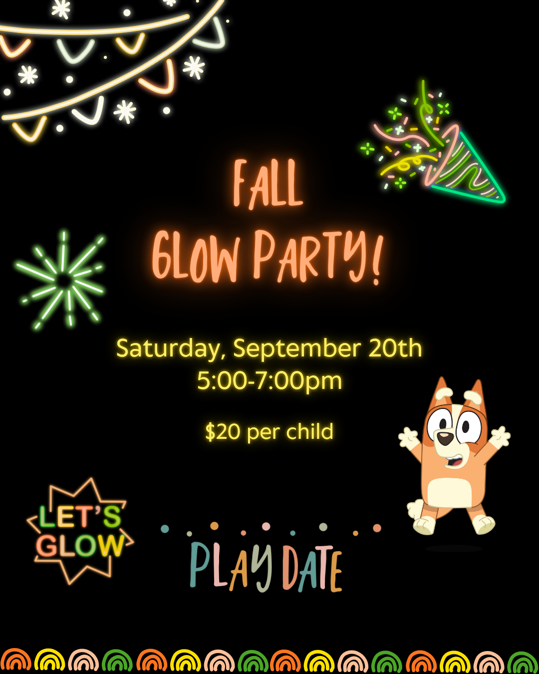 Join us at play date to celebrate the beginning of fall with a Glow Party and a visit from one of our character friends!