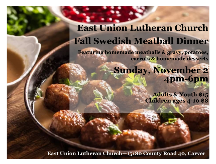 Make plans to attend this Swedish meatball dinner, featuring homemade meatballs & gravy, potatoes, carrots & homemade desserts.