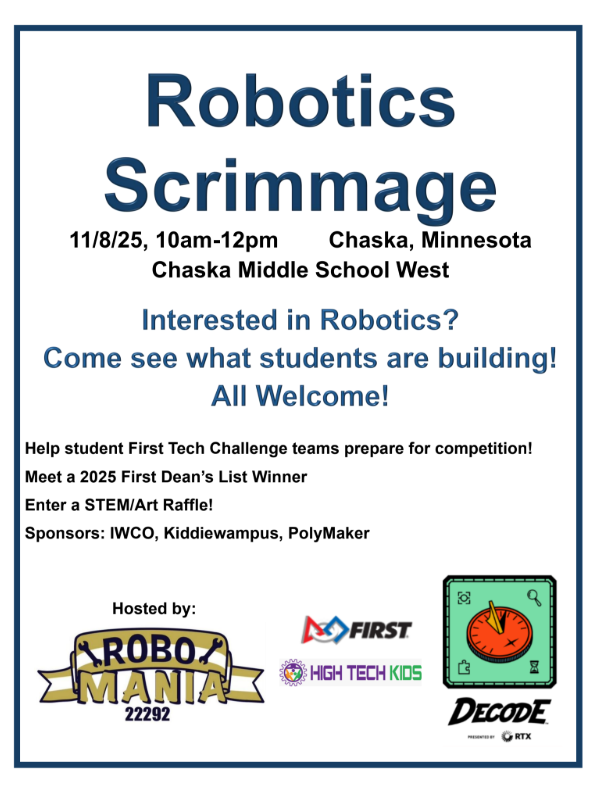 Come watch a robotics practice scrimmage, hosted by Robomania 22292, of District 112 at Chaska Middle School West in the commons.
